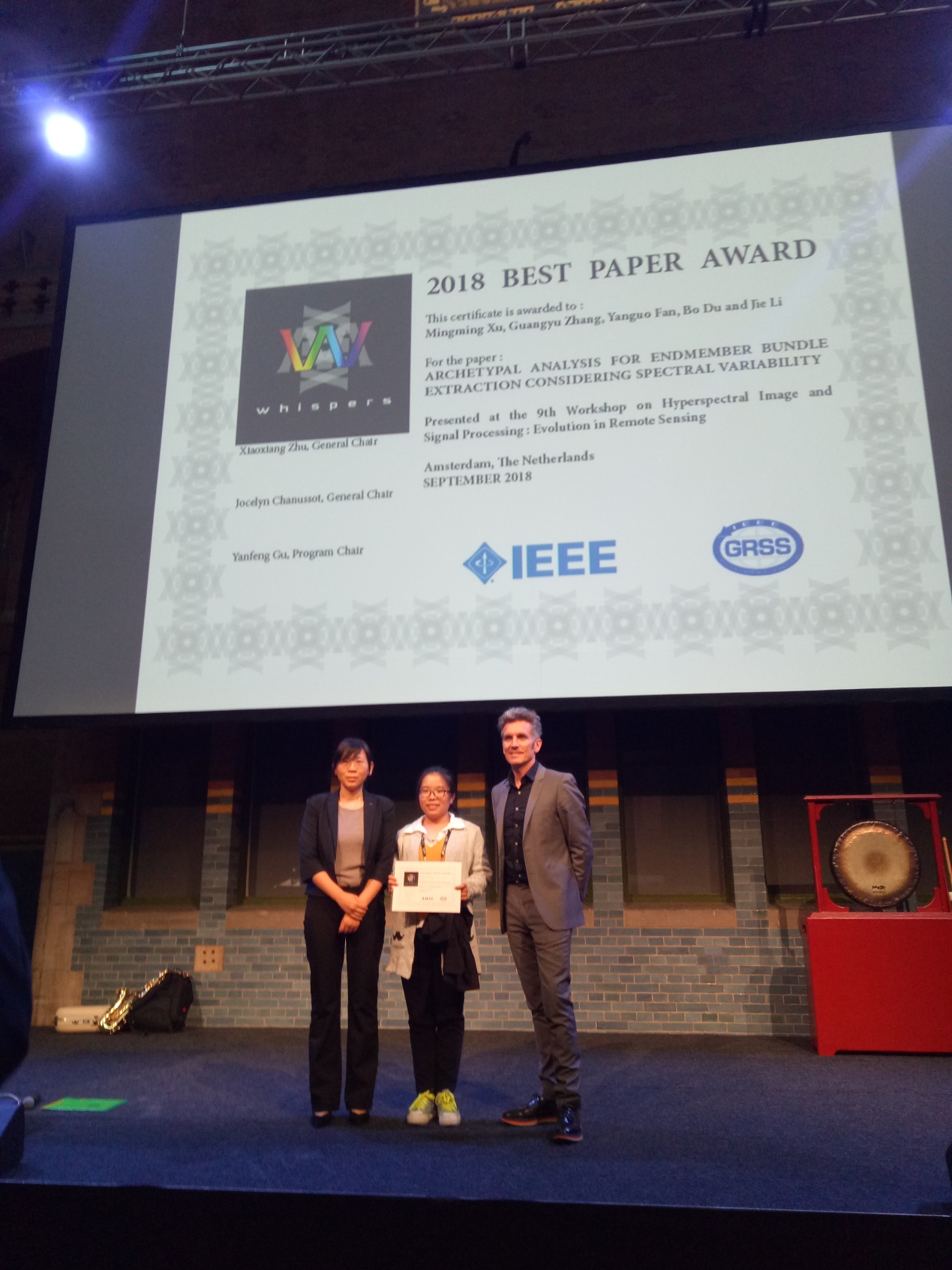 大会主席IEEE Fellow Jocelyn教授及德国慕尼黑工业大学Xiaoxiang Zhu教授为许明明博士颁发最佳论文奖获奖证书
