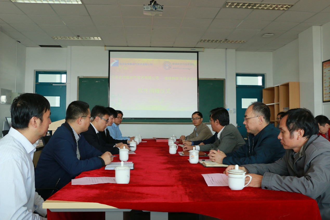 【本站讯】10月11日上午,冰球突破mg正规官网冰球突破mg正规官网“北京金双狐油气技术有限公司双狐软件捐赠仪式”在工科楼C座367会议室举行。北京金双狐油气技术有限公司总经理周国强、学校合作发展处副处长张炜、学院党委书记张卫东、副院长裴仰文,资源系教师代表出席捐赠仪式。