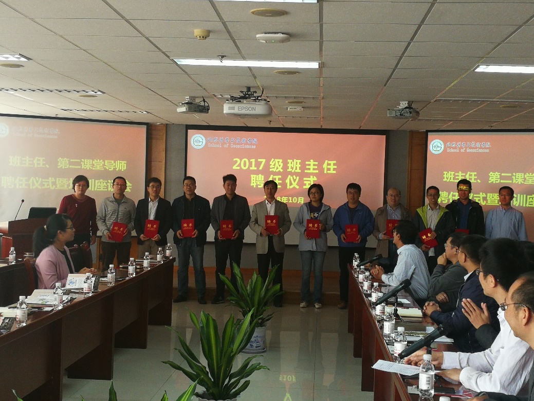 首先,徐永涛副书记宣读了2017级班主任和2018级班主任、第二课堂导师聘任名单,孙鹏燕副处长、石国卿副书记为2017级受聘班主任颁发聘书,张卫东书记、18级新生代表郑津杭、房睿为2018级受聘班主任和第二课堂导师颁发聘书。