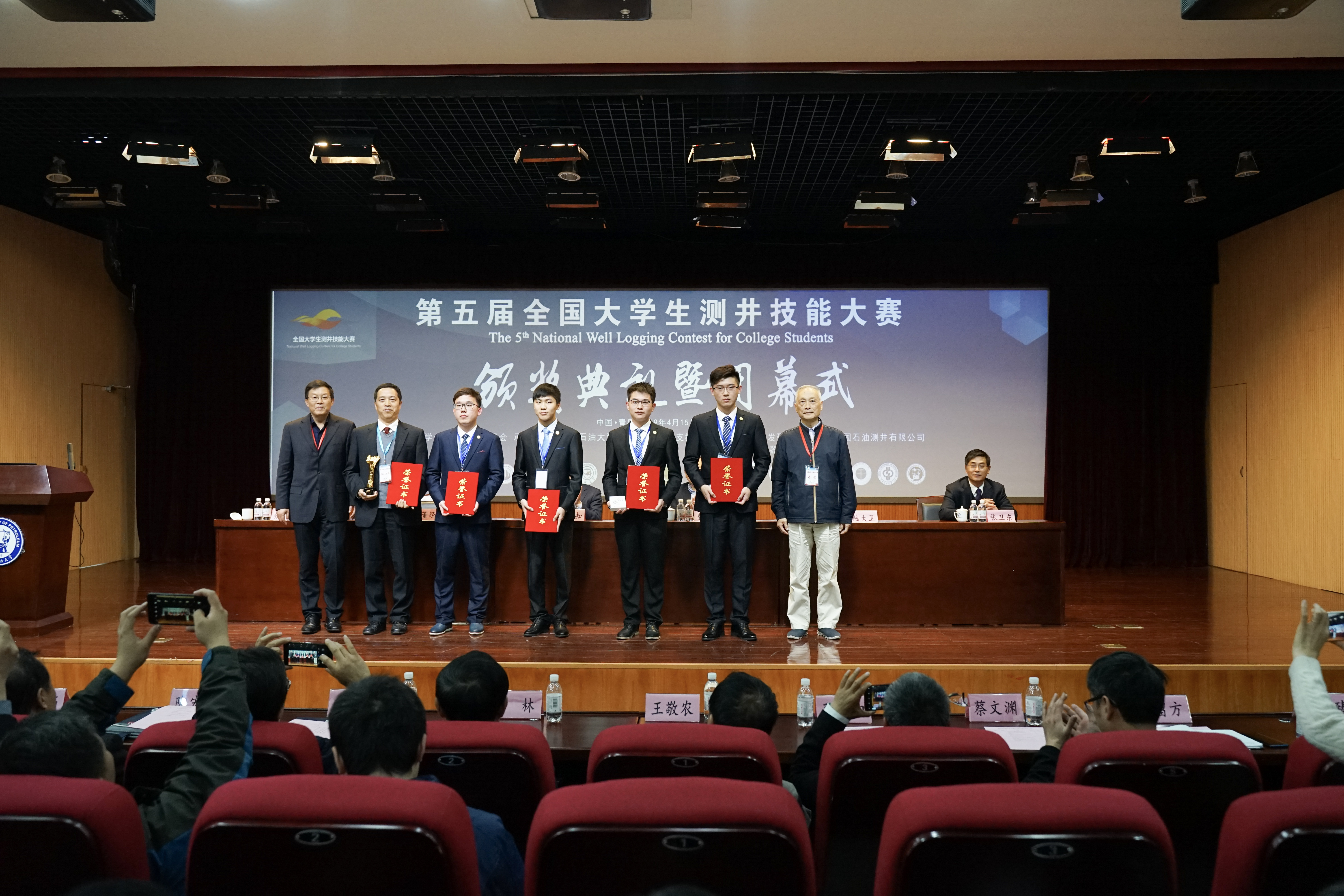 冰球官网由冰球突破mg正规官网测井系4名硕士和8名勘查技术与工程(测井)15级本科同学组成了三个代表队,共获得两项集体奖、四个学生单项奖和两个优秀指导教师奖。其中,由孔令文、李晓东、梁启轩、夏飞月组成的本科生一队获特等奖,由张广栋、张淼鹤、崔瑞康、刘杨组成的本科生二队获一等奖,本科生张广栋获最佳抢答奖,张淼鹤、李晓东和孔令文获最佳理论奖。在近半年的学生选拔、培训和备赛过程中,包括本次获得优秀指导教师奖的张福明和庄春喜在内的测井系全体老师们,站在双一流学科人才培养高度上,充分发挥集体才智,并各自发挥特长,脚踏实地,追求卓越,最终取得佳绩。