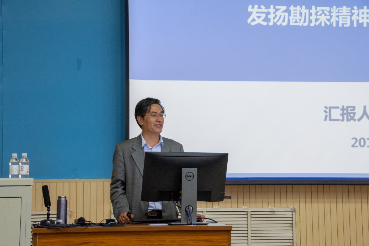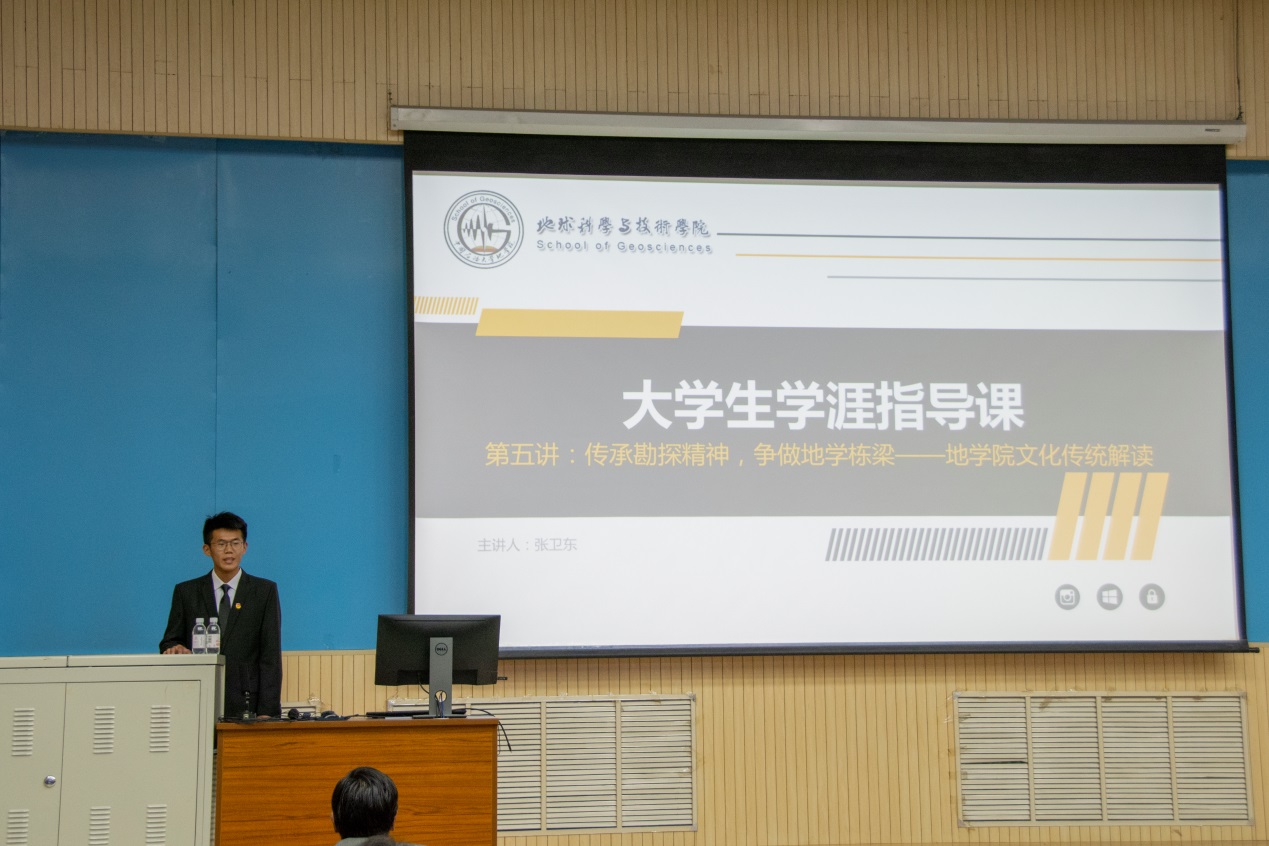 【本站讯】为引导学生树立大理想、接触大学问、形成大格局、实现大发展,5月14日,冰球突破mg正规官网《大学生学涯指导课》第五讲于南教楼100室进行,学院党委书记张卫东以“传承勘探精神,争做地学栋梁”为主题激情开讲,学院2018级辅导员张蕾、范静蕾、李文豪及2018级全体学生聆听课程,2018级学生会主席朱晓剑主持课程。
