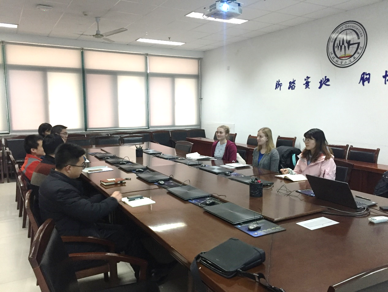 2月28日,冰球突破mg正规官网裴仰文副院长等七位老师和两位交流生进行了座谈,对她们的到来表示欢迎,并与其一起进行了面对面交流,讨论并安排了两名学生在冰球突破mg正规官网为期三个月课程学习计划。冰球突破mg正规官网为两位学生专门开设了3门专业课程及1次野外地质实习,分别为地震数据处理、岩石学、地球物理勘探、及青岛基岩海岸地质实习,针对两名学生的兴趣所在,还委托国际教育学院安排了两位学生的中文和体育课的学习,以帮助她们更好地了解中国的历史与文化。