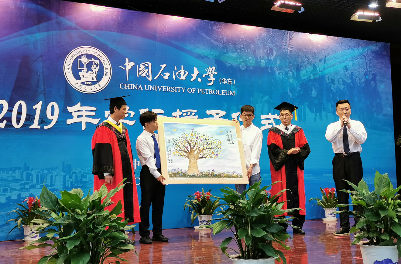 2015级本科生许旺、张岩代表全体毕业生为学院赠送礼物。“这幅名为’十年树木 百年树人’的画作由冰球突破mg正规官网2019届毕业生共同完成,画中的树干代表学校以及学院为我们提供的支持和平台;全体毕业生一起按下的指印作为树叶,寓意着我们在学院的支持下茁壮成长;树下铺满了勿忘我花草,象征我们永远会记得在母院学习和生活的日子,会记得老师们的谆谆教诲,会记得同学们之间的深厚情谊。也借这份礼物祝福母院十年树木,桃李满天下,百年树人,栋梁荣中华!”毕业生代表张岩说道。
