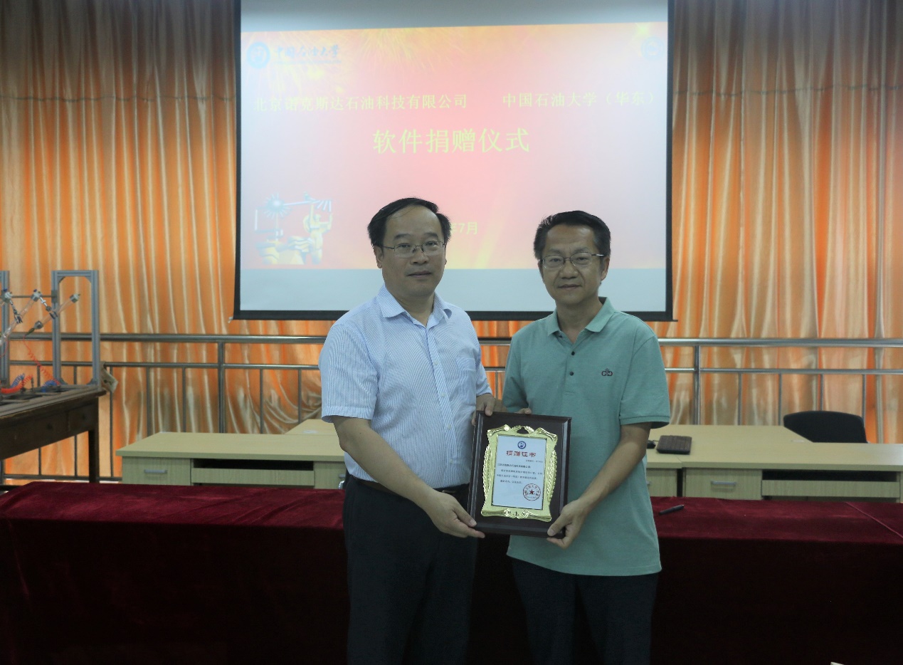 姚军代表学校向刘力辉颁发捐赠纪念牌,冰球突破mg正规官网院长林承焰与刘力辉共同签署了Geoscope软件捐赠协议。