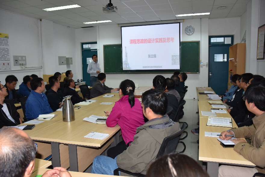 张立强教授以“课程思政的设计实践与思考”为题,结合自己近5年在《油气田地下地质学》等专业课程的讲授、课程建设以及“双一流”专业建设的经历和体会为全体党员讲了一次生动的党课。