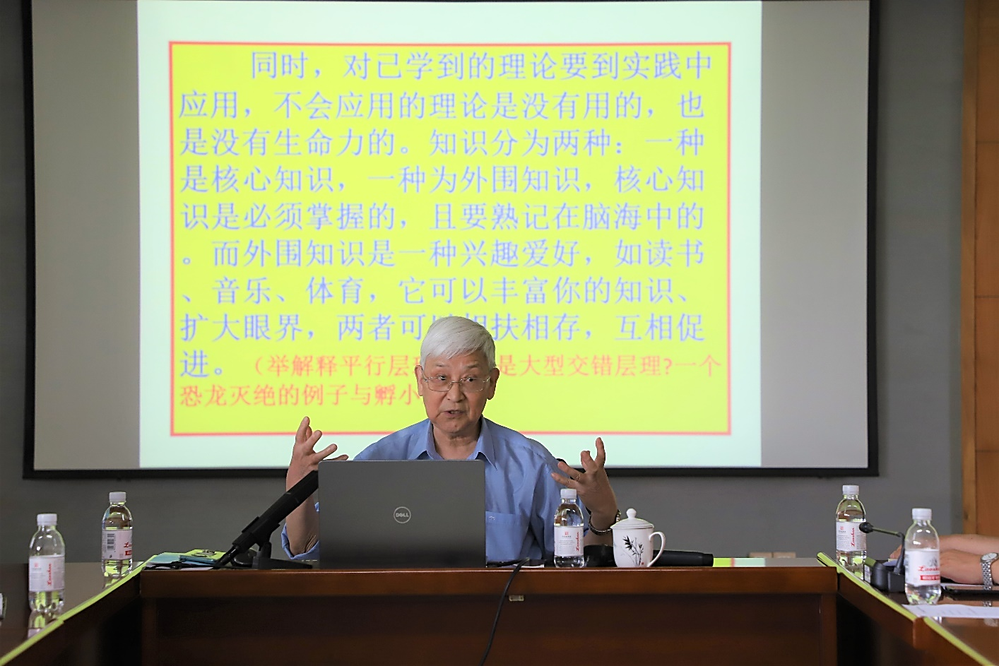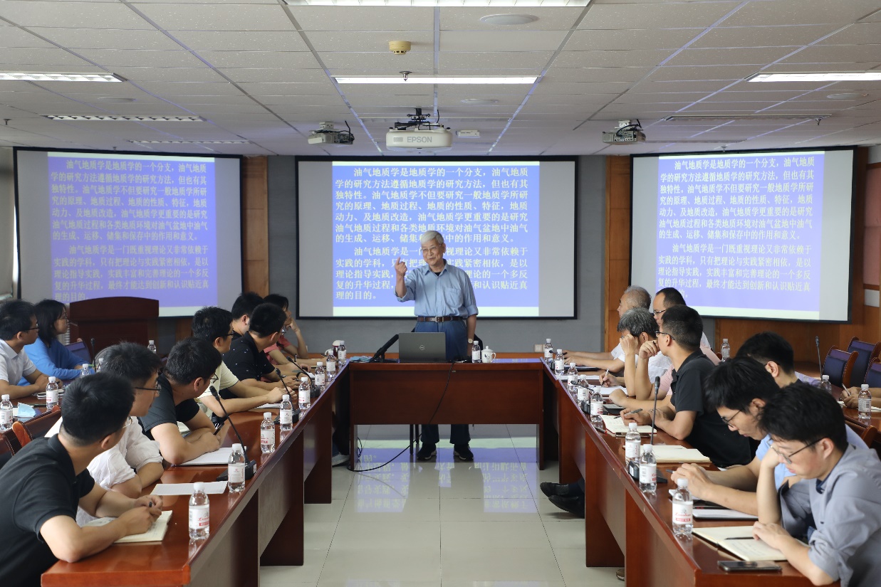 随后,顾家裕以“如何成为一个合格的石油地质工作者”为题,结合自身的工作经历,围绕树立远大的政治理想和油气地质学研究者具备的基本素质两个方面,向在场青年教师传授经验和心得。顾家裕认为,对一个石油地质科技工作者来说,首先要有崇高的政治思想,即立足岗位,心怀祖国。其次要具备油气地质学研究者的基本素质,即掌握油气地质学的基本理论和实践知识,学习分类学,学好计算机和外语,勇于创新,具有一定的想象力、坚忍不拔的毅力和团结协作的品质。此外,他还指出地质学是汇报的学科,做好工作的同时也要写好报告,重视每一次的汇报工作。