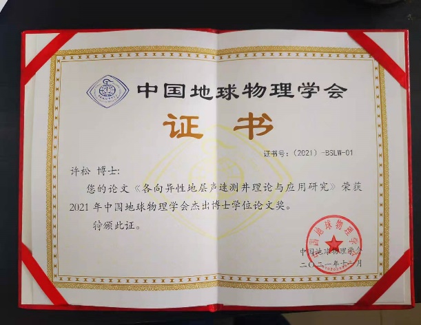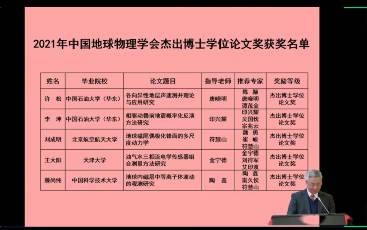 12月15日,2021年中国地球物理学会颁奖典礼在线举行,冰球官网地质资源与地质工程专业许松博士和李坤博士的学位论文分别荣获2021年中国地球物理学会杰出博士学位论文。