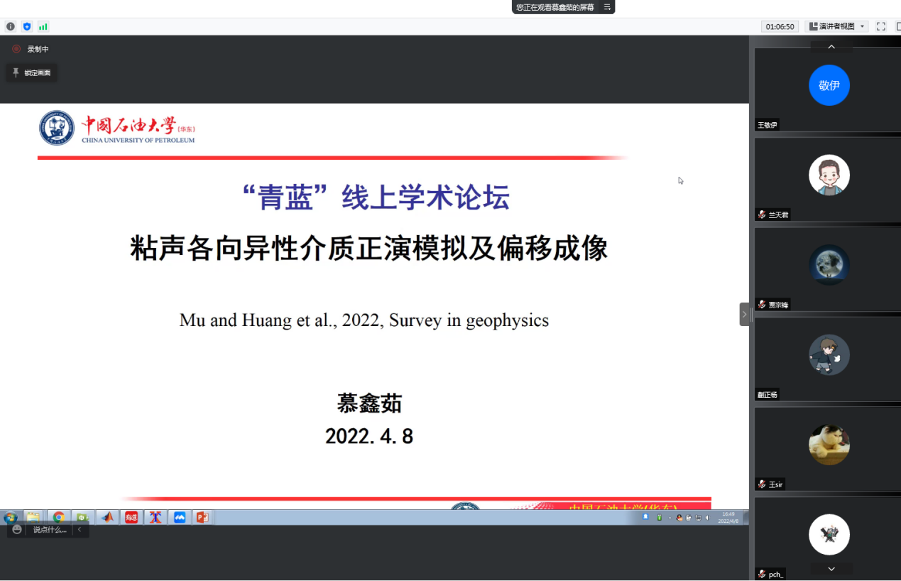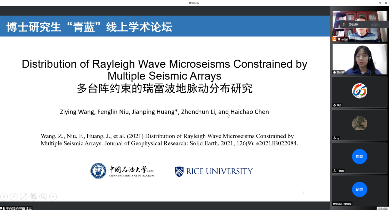 为进一步活跃研究生学术氛围,提高博士研究生的学术报告能力,在学校研究生院的大力支持下,博士研究生“青蓝”线上学术论坛冰球突破mg正规官网分论坛于4月8日下午正式开讲,报告均采用腾讯会议线上形式进行,会议由地球物理系副主任徐凯军副教授主持,来自学校的各级博士和硕士生共80余人参与交流。