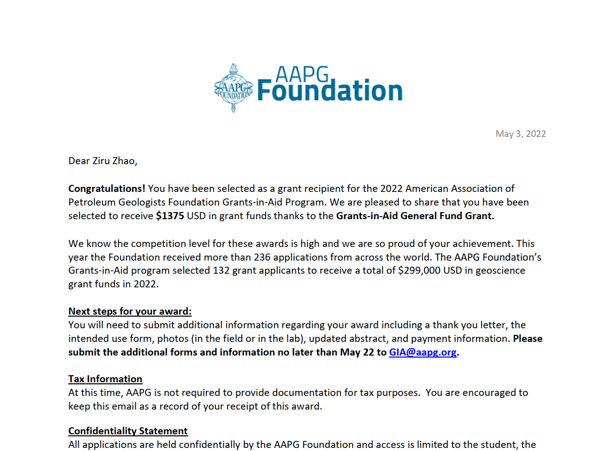 AAPG全球助研金(GIA,Grants-In-Aid)是由美国石油地质家协会(AAPG)面向全球硕士和博士研究生设立的基金资助项目,旨在支持在石油和能源矿产资源的勘探开发或相关环境地质问题等方面的研究,为研究生提供财务资助,以支付其与论文工作直接相关的费用,例如现场工作,实验室分析等。该项资助的申请工作一般在9月份开始,结果公布时间为次年3-5月。2022年全球共有132名学生成功申请获得资助,基金总资助金额为299000美元。