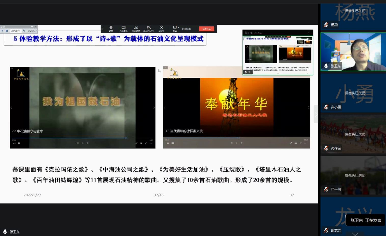 张卫东教授结合主讲的“中外石油文化”、“石油科技与创新”等两门通识课程,进行了精彩分享。课程打造了课程文化,建立了6种教学方法,形成了6种模式。采用线上线下混合式教学方法,形成了多元化的评价模式;运用合作式教学方法,形成了角色扮演的深度合作学习模式;创建沉浸式教学方法,形成了“讲英雄故事”的课程思政教学模式;利用个性化教学方法,形成了“音频作业-优秀作品评选-视频作品”教学成果产生模式;创新体验教学方法,形成了以“诗+歌”为载体的石油文化呈现模式。课程建设成果丰硕,双双入选首批教育部课程思政示范课程。
