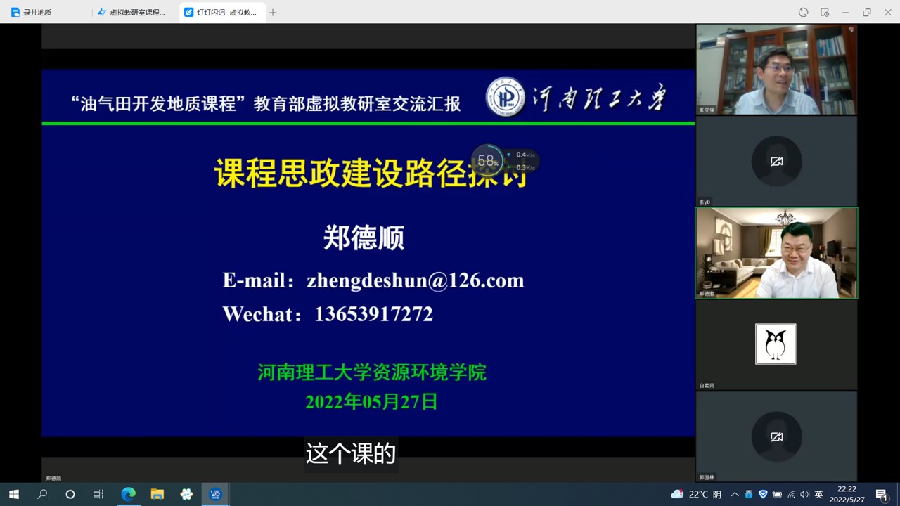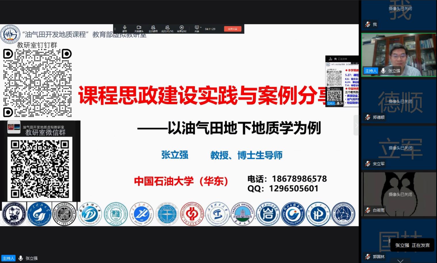 油田开发地质课程教育部首批虚拟教研室建设点从今年3月开始开展了系列研讨活动,规划了教研室2022年工作重点、规范了教学活动时间和相关制度。按照计划,5月27日,油气田开发地质课程教育部虚拟教研室开展了课程思政专题分享和研讨活动。来自冰球突破mg正规官网、中国地质大学(武汉)、中国矿业大学(北京)、吉林大学、西北大学、长安大学、中国石油大学(北京)、东北石油大学、西安石油大学、河南理工大学、山东科技大学、青海大学等20余所高校的56名教师参加了本次研讨活动。冰球突破mg正规官网张立强教授主持了会议。