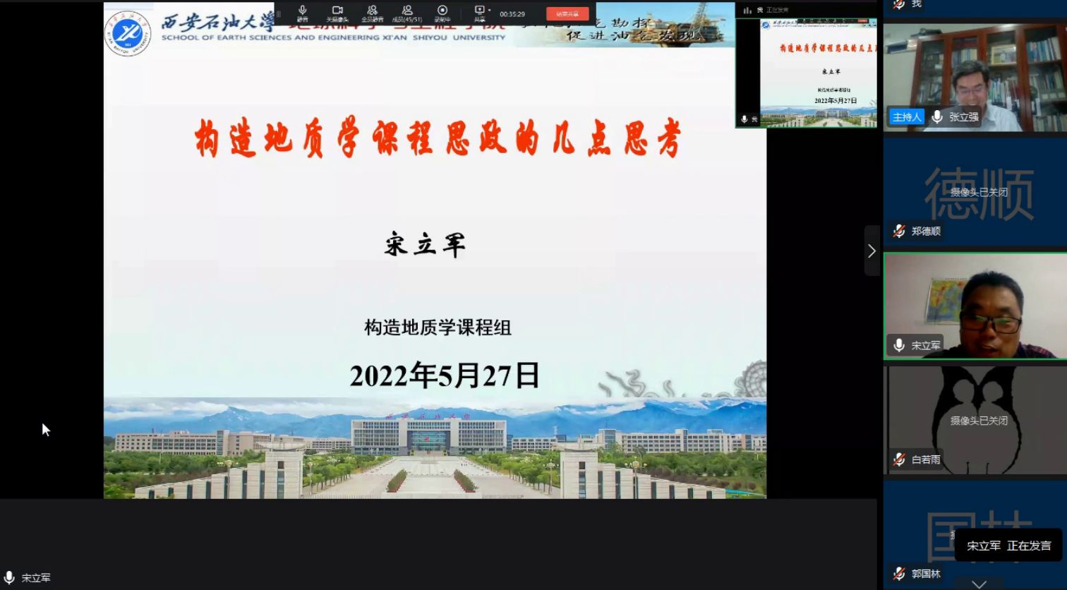 宋立军教授结合构造地质学课程,从学校定位特色、课程特点、授课对象特点、课程思政的理念与特色、课程思政的源泉与目标、课程思政元素的凝练等六个方面进行了精彩分享。以习近平总书记新时代中国特色社会主义思想为指导,立足“行业、学校、课程”三个特色,“讲专业、点寓意、引导学生”凝练案例,构建了以“不朽的精神、永恒的力量,学校定位、专业特色”为牵引,“课程思政”贯穿于“专业知识学习、技能训练、能力培养”,“技术能力+非技术能力”有机融合、协调培养的课程思政教学体系。