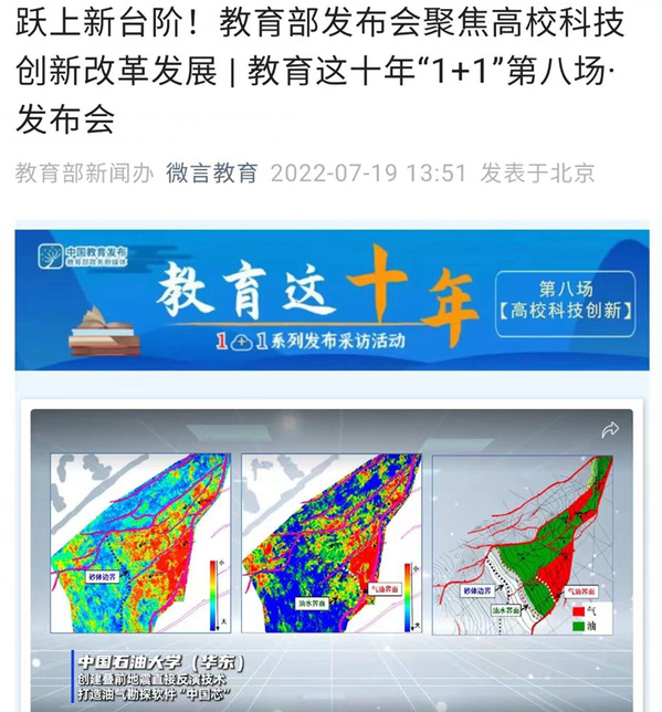 7月19日,教育部举行“教育这十年”“1+1”系列发布采访活动的第八场新闻发布会,介绍党的十八大以来高校科技创新改革发展成效。发布会播放了视频短片《十年攻坚克难 创新引领发展—中国高校科技创新改革发展这十年》,回顾这十年高校科技创新发展的有关情况。视频中高校科技创新服务贡献卓越部分,面向国家重大需求,在能源等战略必争领域,补短板,强能力,为国家发展和安全提供保障,画面展示了冰球突破mg正规官网:创建叠前地震直接反演技术,打造油气勘探软件“中国芯”。