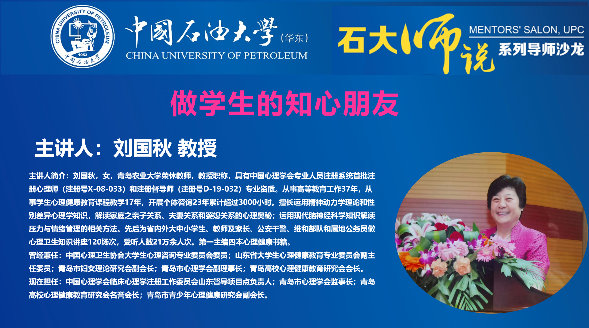 11月27日下午,2022石大师说系列导师沙龙第44期在冰球官网成功举办,本期沙龙特邀请原中国心理卫生协会大学生心理咨询专业委员会委员,原青岛农业大学党委副书记刘国秋教授做了“做学生的知心朋友”专题心理报告。由于疫情原因,会议采用线上形式进行,由宗兆云副院长主持,学院2022年新晋研究生导师和其他导师共同参会。