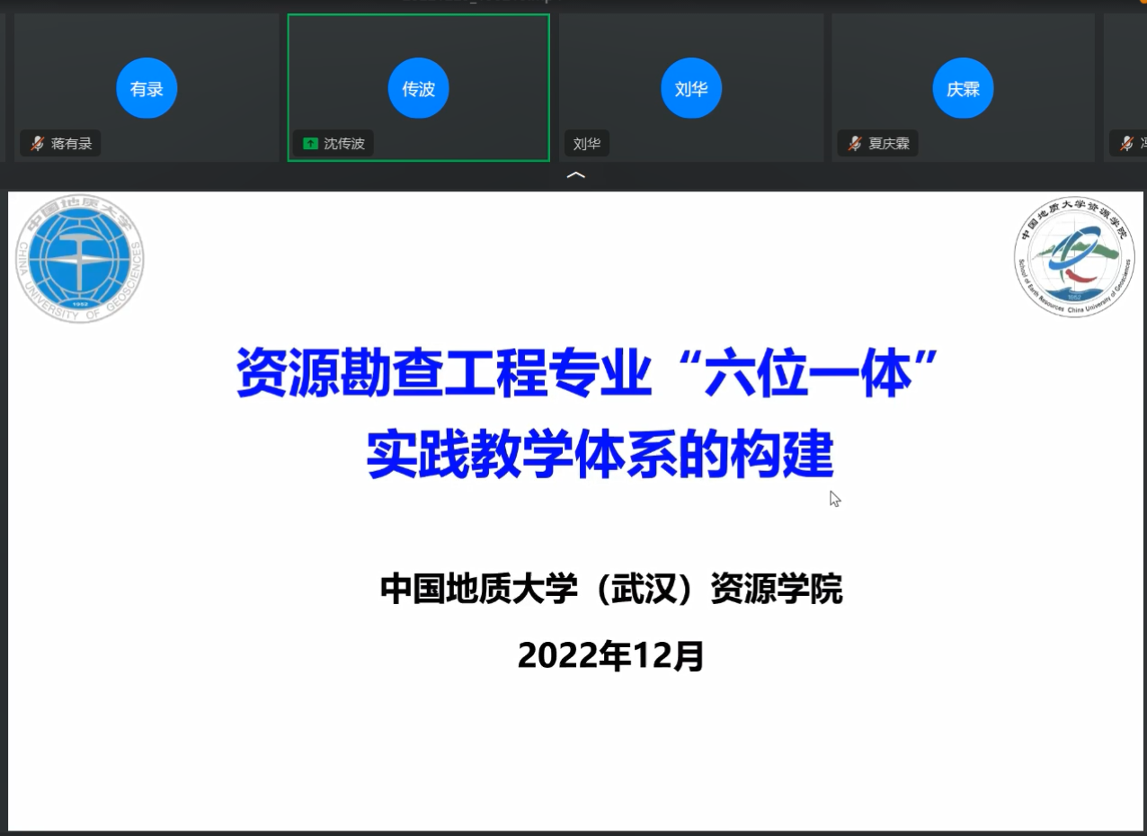 2022年12月25日,资源勘查工程专业教育部虚拟教研室举办了“实践教学体系构建”专题论坛,中国地质大学(武汉)资源学院副院长沈传波教授应邀作《资源勘查工程专业“六位一体”实践教学体系的构建》专题报告。专题论坛由冰球突破mg正规官网冰球突破mg正规官网院长刘华教授主持,来自中国石油大学、中国地质大学、中国矿业大学、西北大学等十余所高校的60余名教师参加了专题论坛。
