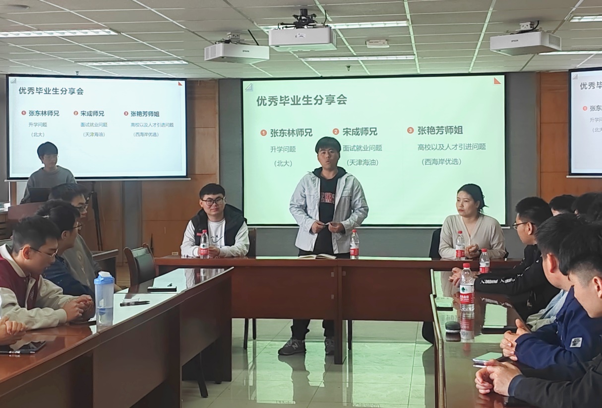 随后,中海油(天津)签约者宋成与在场同学交流求职心得与面试经验。宋成同学详细介绍了中石油、中石化、中海油的重点企业,为在场同学提供求职选择,并分析了工作地域、企业文化对求职的影响。交流过程气氛活跃,关于如何准备面试的问题,宋成鼓励同学们在面试场上展现出风采,重点指出要结合岗位要求回答面试官的问题。