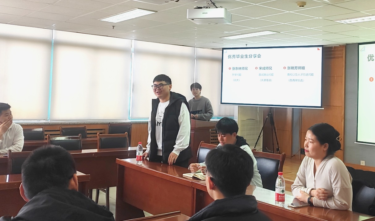 首先,学校“十大学生标兵”获得者张东林以自己的北京大学博士升学经历为例,分享了硕士研究生申博需要注意的关键点。他指出,研一研二的同学需要打好扎实的科研基础,及早明确自己的意向院校,发挥主观能动性,积极联系意向导师,为申博做好充足的准备。