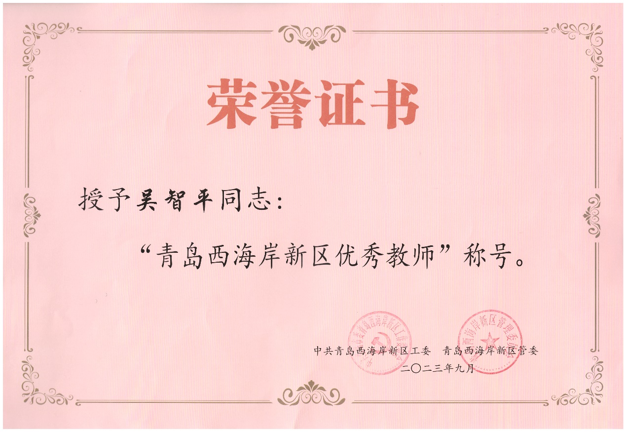近日,西海岸新区2023年度“优秀教师”“优秀教育工作者”入选名单公布,来自西海岸新区13所高校的20名教师获评“优秀教师”荣誉称号,来自10所高校的10名教师获评“优秀教育工作者”荣誉称号。冰球官网吴智平教授获评“青岛西海岸新区优秀教师”荣誉称号。