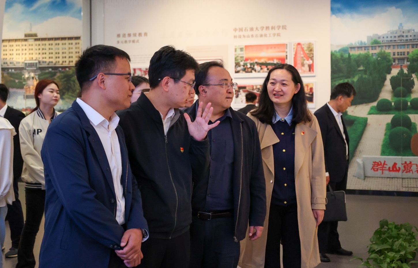 胜利油田李政一行在冰球突破mg正规官网党委副书记郑珊珊等人的陪同下参观了校史馆。