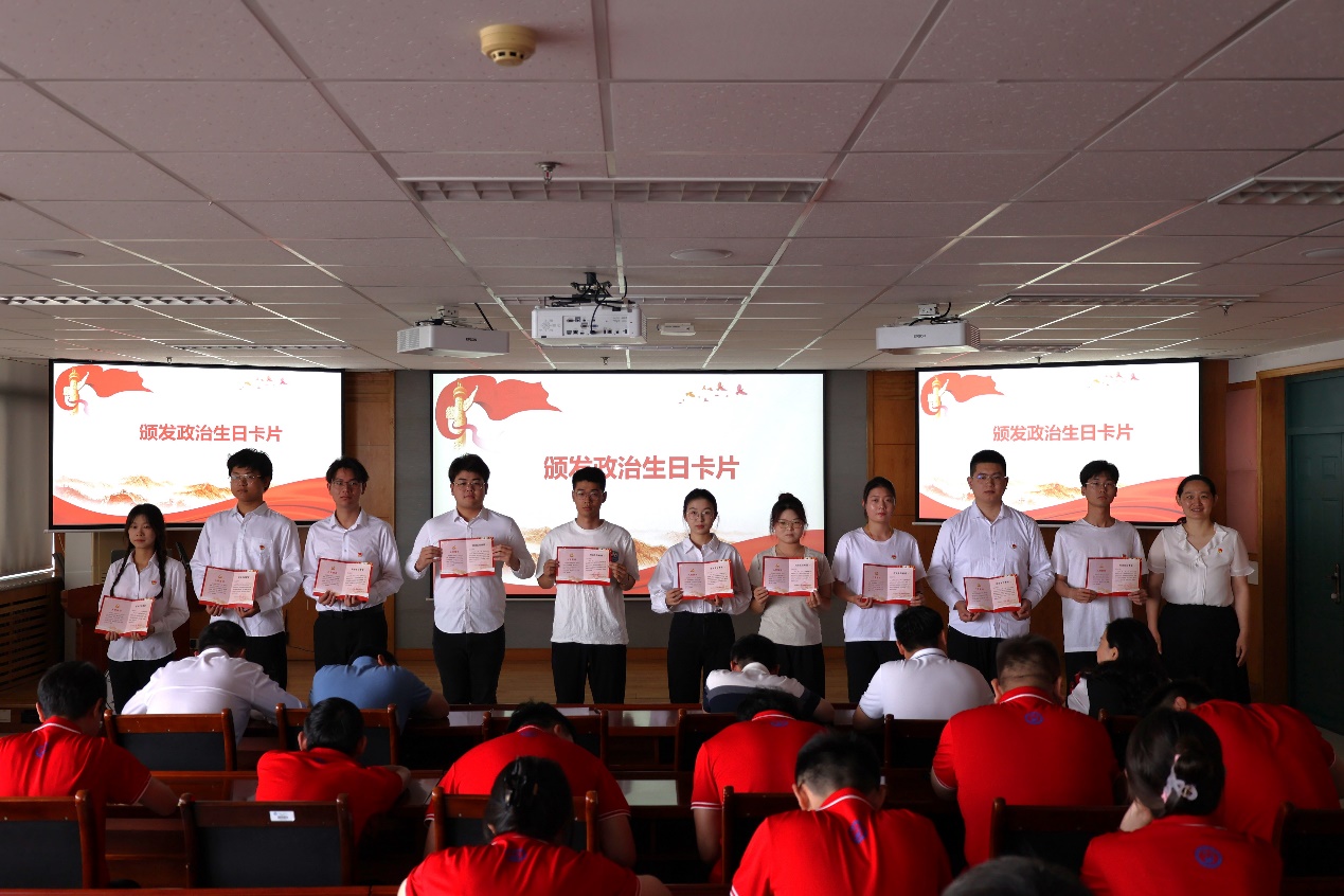 郑珊珊向新发展党员代表颁发政治生日卡片。新发展党员代表、勘查2202班张栩赫表示,要继承和发扬伟大的建党精神,坚持真理、坚守理想,践行初心、担当使命,在实现中华民族伟大复兴的生动实践中放飞青春梦想,在为人民服务的不懈追求中书写人生华章。