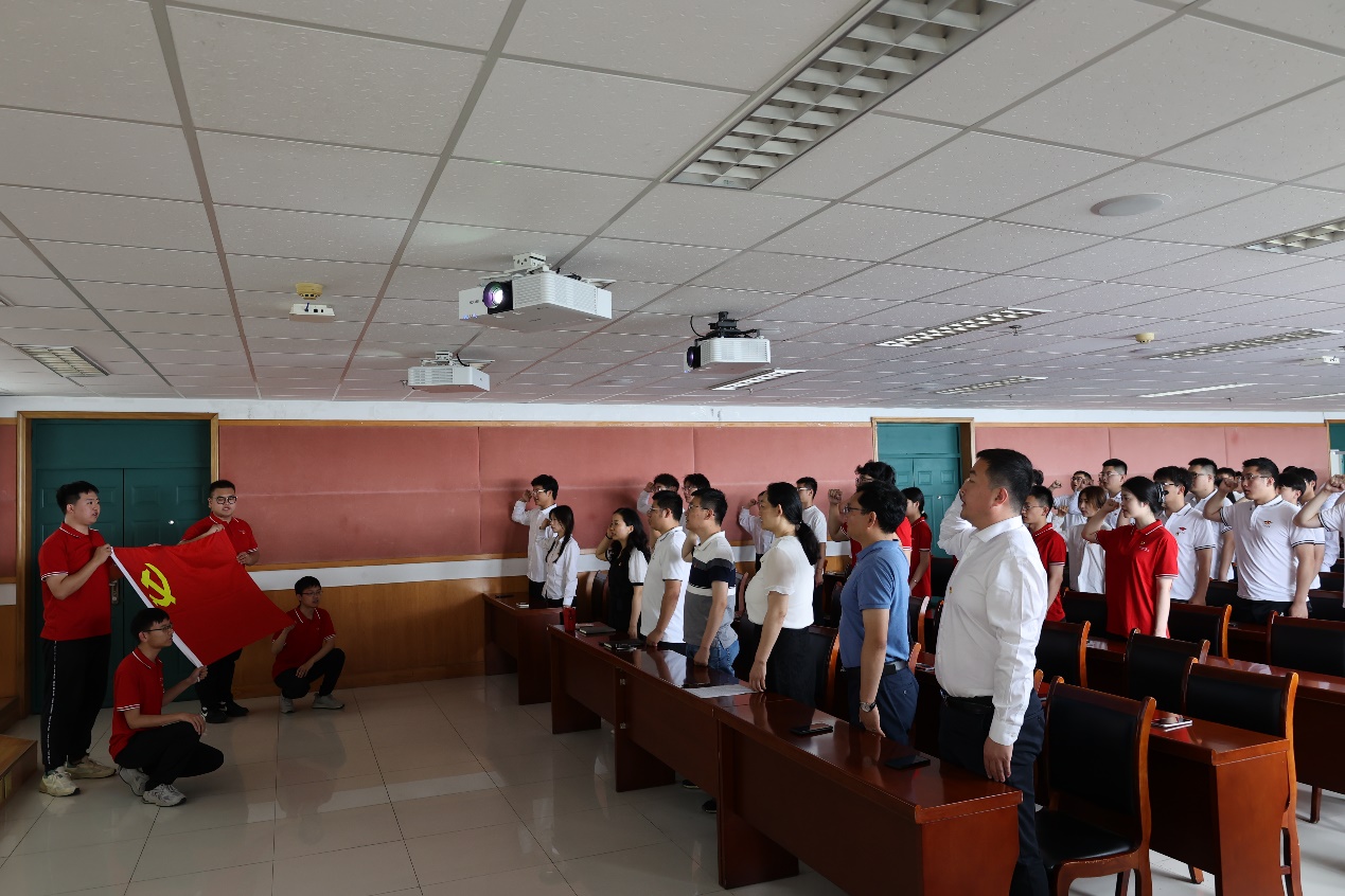 仪式现场奏响国际歌。随后,新党员进行入党宣誓,毕业生党员重温入党誓词,资源专业本科生党支部组织委员刘牧原领誓。