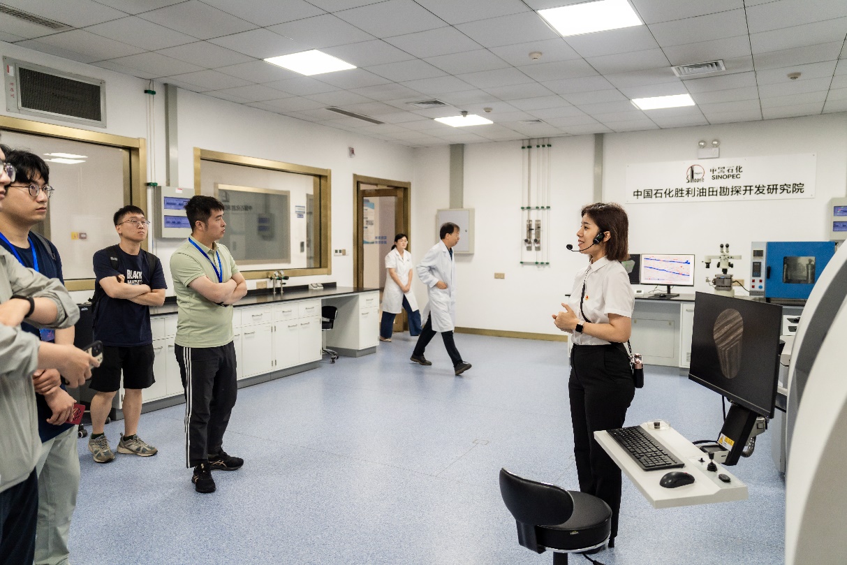座谈结束后,实践团随队实地探访了勘探开发研究院内的重点实验室。研究院设有31个研究室和实验室,实践团主要探访了页岩油研发中心和碳捕集、利用与封存(CCUS)重点实验室。据负责人介绍,页岩油研发中心主要负责给岩石做“CT”,精准定位原油藏在什么位置;而碳捕集、利用与封存(CCUS)重点实验室主要研究将捕集之后的二氧化碳注入油层,这样既可以提高采油率,又能实现二氧化碳“入地为宝”。通过对重点实验室的实地探访,实践团成员零距离接触了科研的一线资料。