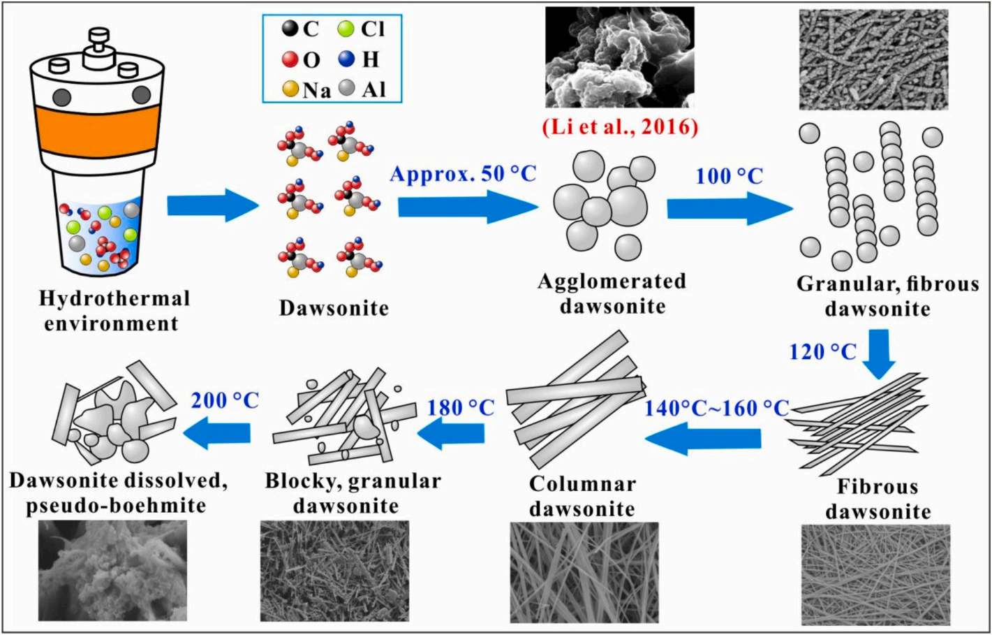 目前,片钠铝石的合成方法很多,但并不针对碳封存,且大多数合成方法都依赖含碳酸根或碳酸氢根离子的化学试剂作为实验前体,二氧化碳的参与有限,其最佳的合成条件仍存在争议。因此,探索如何在二氧化碳的参与下快速、大量合成片钠铝石,以实现二氧化碳矿化封存,值得进一步研究。针对上述问题,冰球突破mg正规官网冰球突破mg正规官网张洋晨博士在导师曲希玉副教授的指导下,基于物理模拟实验、X衍射分析、扫描电子显微镜分析等方法,以AlCl3 · 6H2O、NaOH、NaCl和CO2为初始原料,在不同温度、pH值和反应时间下,利用水热法合成了纯相片钠铝石。比较了不同条件下合成的片钠铝石的纯度、形态、尺寸和质量,明确了利用二氧化碳合成片钠铝石的最佳条件,探讨了片钠铝石的水热合成机理,并初步评估了片钠铝石的固碳潜力。结果表明,pH值为8.5–10.5、温度为 100–180 ℃,反应时间≥6 h,均可合成纯相片钠铝石(图1);温度和pH值都会影响片钠铝石水热合成的纯度、合成量和形态,温度对片钠铝石纯度和形态的影响更为明显;延长反应时间对片钠铝石的合成量和纯度影响极小;温度为140 ℃、pH值为9.5时,片钠铝石的合成量和二氧化碳矿化率均达到最大值。这表明该温度和pH值条件可能是利用二氧化碳进行热液合成道森石的最佳实验条件,也可能是二氧化碳矿化封存的理想条件。温度较低时(50 ℃),片钠铝石成核速率远大于生长速率,出现团聚现象;当温度达到100 ℃时,片钠铝石的成核速率和生长速率都会增加,并且粒状片钠铝石晶体沿一定方向逐渐长成针状;120~160 ℃时,生长速率大于成核速率,晶体均匀性和分散性增强,直径增大;温度为180 ℃时,生长速率和成核速率均降低,片钠铝石合成量显著减少,晶体直径减小;当温度为200 ℃时,片钠铝石开始溶解,体系中出现拟薄水铝石(图2)。该成果在二氧化碳矿化封存及片钠铝石快速合成以工业化利用等方面提出了新的认识。并将片钠铝石的稳定性及富集条件等纳入到后续研究中。