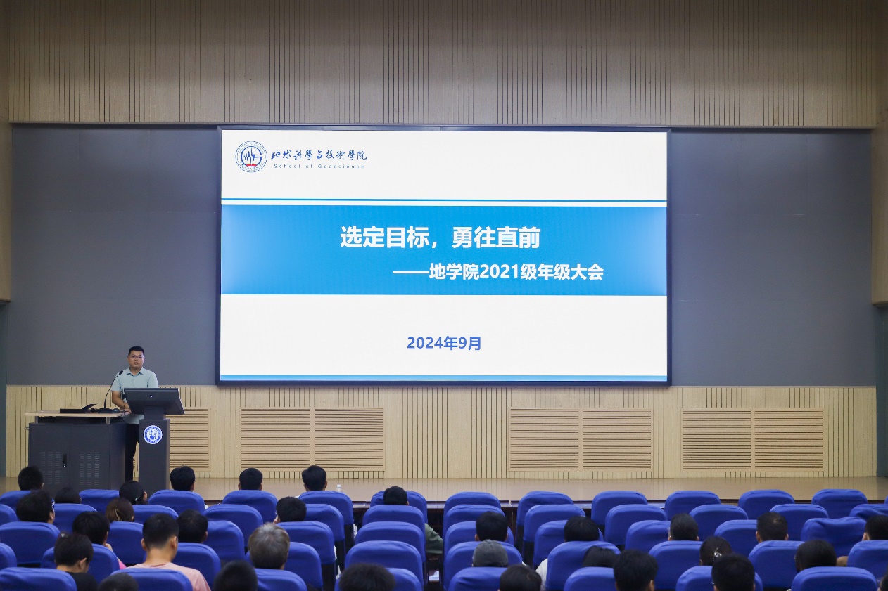 9月25日下午,学院2021级于南教楼100召开主题为“选定目标,勇往直前”的年级大会。本次会议由学院2021级辅导员任金恒主持,研究生辅导员栗磊、辅导员王子航和2021级全体本科生参加会议。为让学生进一步了解石油行业发展情况,本次会议特别邀请中石化胜利油田党委组织部高级主管李国栋、主管王鹏飞、电力分公司滨南供电管理区党支部书记隋鹏飞,介绍油田近况,分享就业经验。