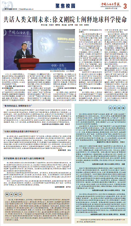4月12日出版的《中国石油大学报》第3版,整版聚焦地球科学,围绕徐义刚院士《地球科学与人类文明》学术报告,访谈冰球官网7名师生,畅谈服务国家能源战略、开展跨学科交叉、青年地学人才发展等方面的感悟和规划。