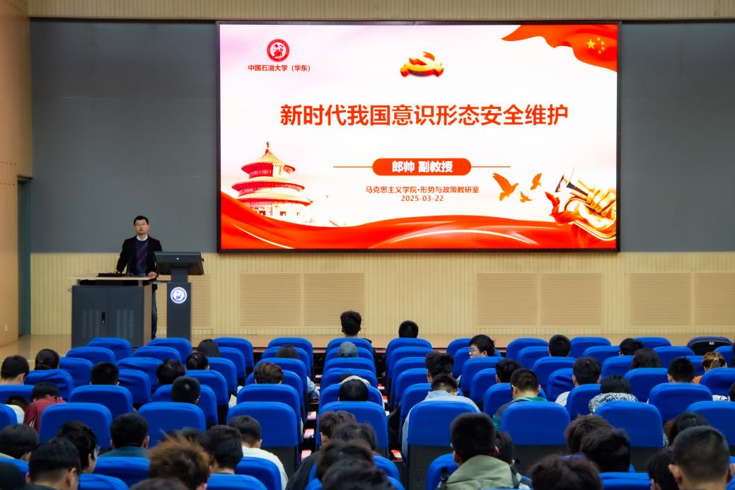 学院邀请马克思主义学院郎帅副教授讲授“新时代我国意识形态安全维护”主题团课。从新时代意识形态安全的主要内涵,影响因素以及维护的要求三部开展授课,面向团员青年开展国家安全教育。