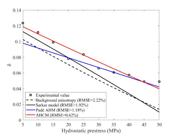 图2. 有效Thomsen参数ε(左图)与δ(右图)在不同静水压力条件下各种逼近模型结果对比,包括实验测量结果、应力诱导的背景各向异性、Sarkar弱各向异性模型、Padé AHM等效各向异性模型以及AHCM等效各向异性模型,图中标注了各模型对应的均方根误差(RMSE)