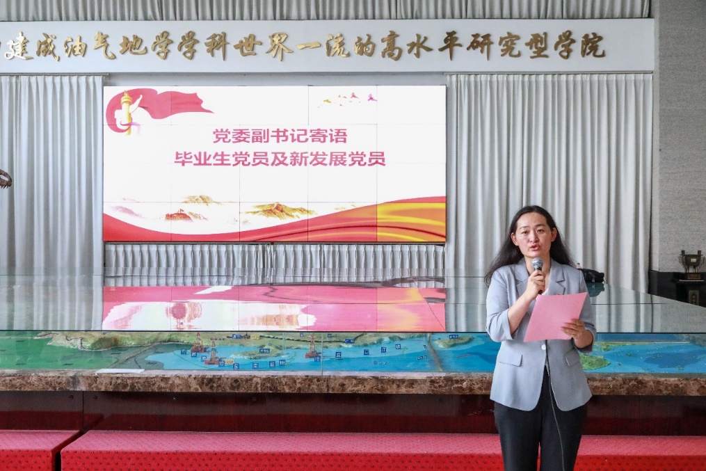 毕业生党员代表刘岩鑫担任班级班长、党支部委员,他刻苦学习、积极奉献,获中国石油奖学金、全国大学生地质技能竞赛特等奖、优秀学生干部等奖励,已保送至南京大学继续攻读研究生。发言中他希望同志们牢记勘探尖兵的使命担当,永远向地层深处探寻,像石油般燃烧炽热能量,将信仰深深扎根于“为人民服务”的厚土之中,在祖国最需要的地方,勇于担当、积极作为,绽放属于青年党员的光芒。