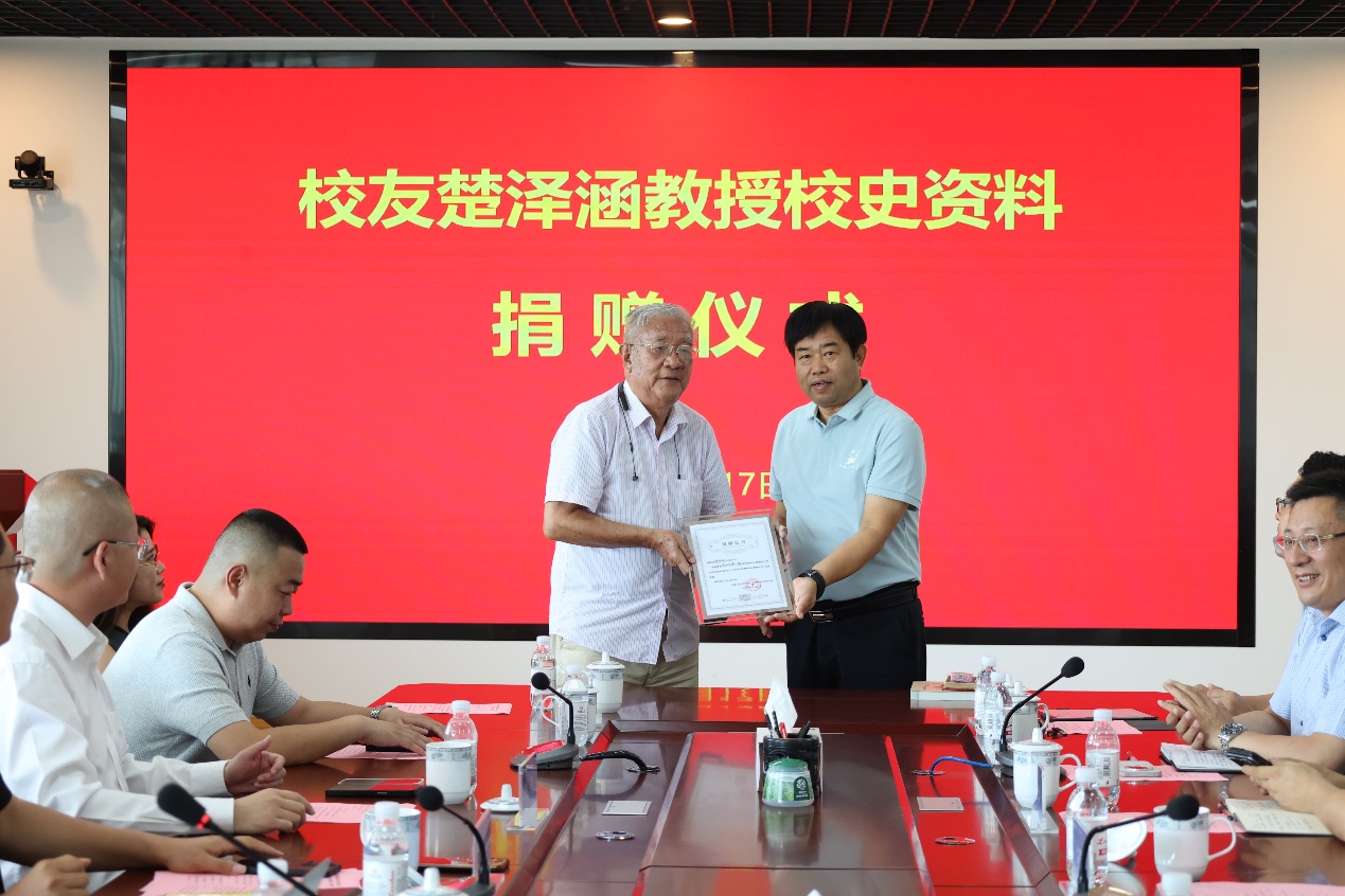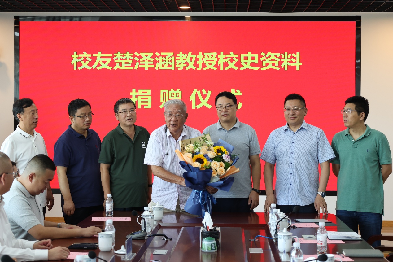 在全体与会嘉宾的见证下,王进与胡义贵共同签署了奖学金捐赠协议并完成捐赠授牌。仪式上,楚泽涵教授还向学院捐赠了珍贵的校史资料,包含其学习笔记、北京石油学院校徽等,由牛庆玮代表学院接受。测井系教师代表向楚泽涵教授敬献鲜花,表达崇高的敬意。