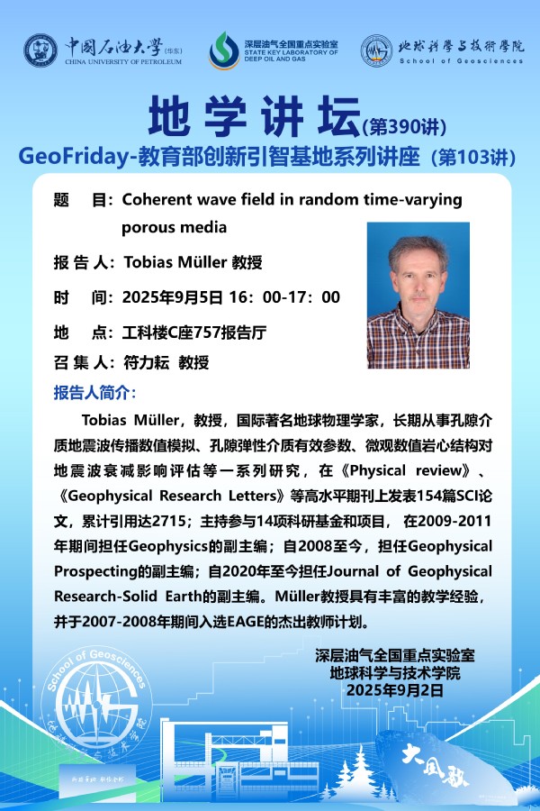 【地学讲坛第390讲】关于Tobias Müller 教授《Coherent wave field in random time-varying porous media》学术报告的通知