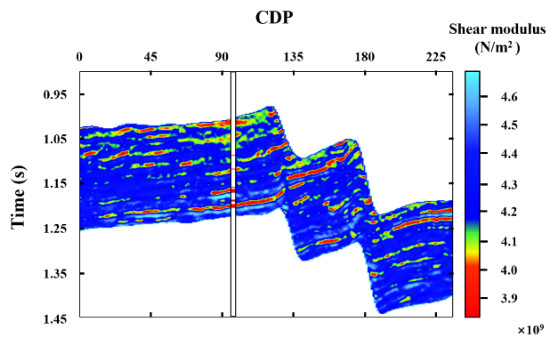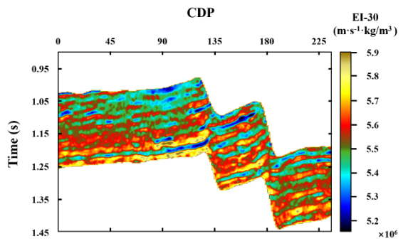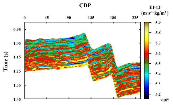 在实际工区数据测试中,我们从中国东部的一个高孔隙度砂岩储层中选取了一个过间剖面来进行实际地震数据的反演。图2展示了在工区内以四个不同入射角度(分别为 12 度、21 度、25 度和 30 度)获取的过井A的地震剖面。该剖面中,有两个主要的高孔隙度含油砂体储层,它们在解释中的红色位置与井 A 相交。