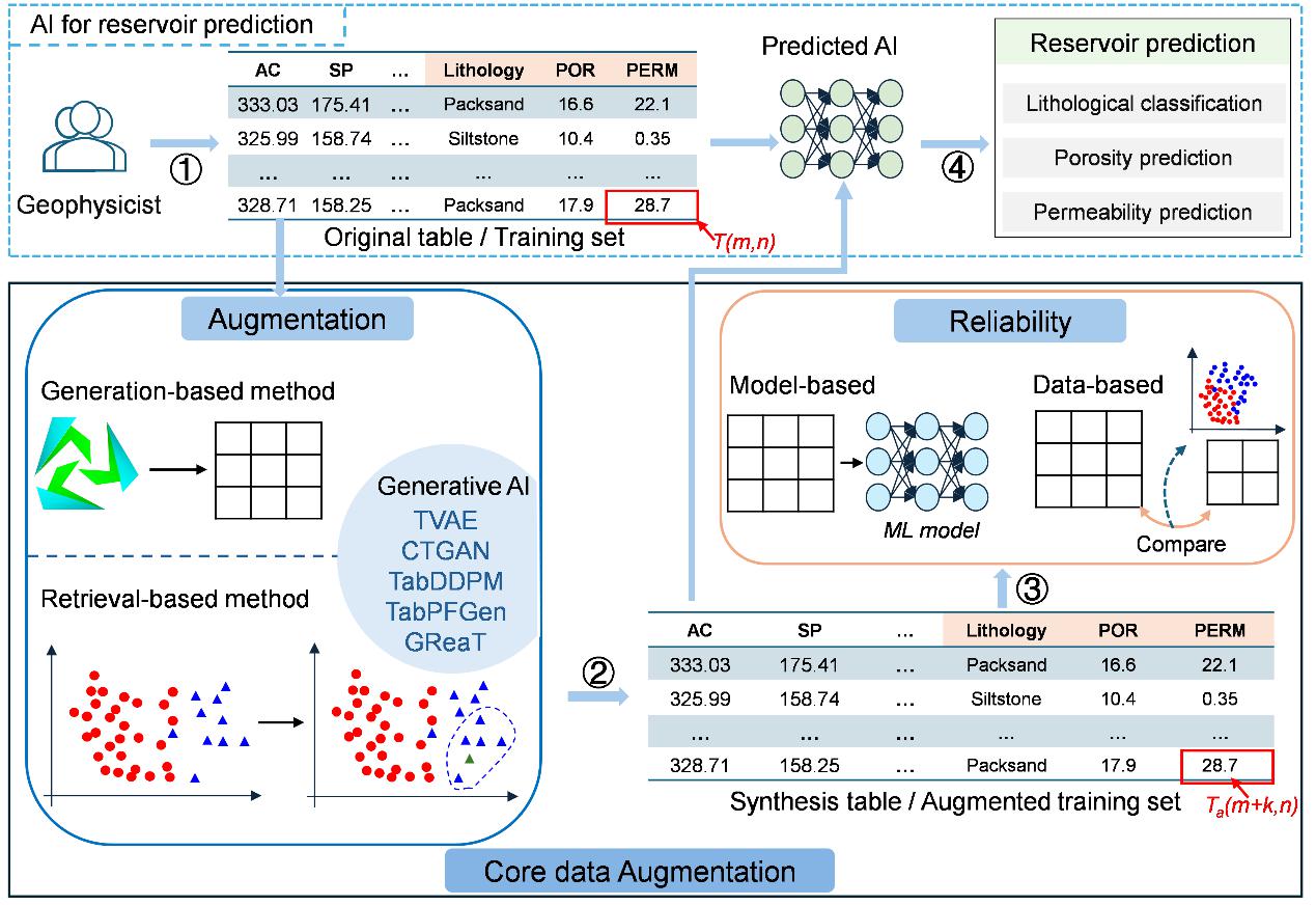 依赖岩心数据作为数据集标签的机器学习模型已成为预测储层参数的主流方法。然而,与岩心数据采集相关的高成本和空间采样密度不足往往导致这些模型的非线性表示较弱、泛化能力差和过度拟合。为了应对有限的岩心数据挑战,我们提出了一种可靠性分析驱动的工作流程,该工作流程优化选择多种岩心数据增强方法来增强储层参数预测(图1)。进而,为增强油气勘探小样本储层参数预测提供了可复现框架,进而证明合成数据增强能够有效缓解数据稀缺性,为地球物理数据分析提供一种借鉴思路。