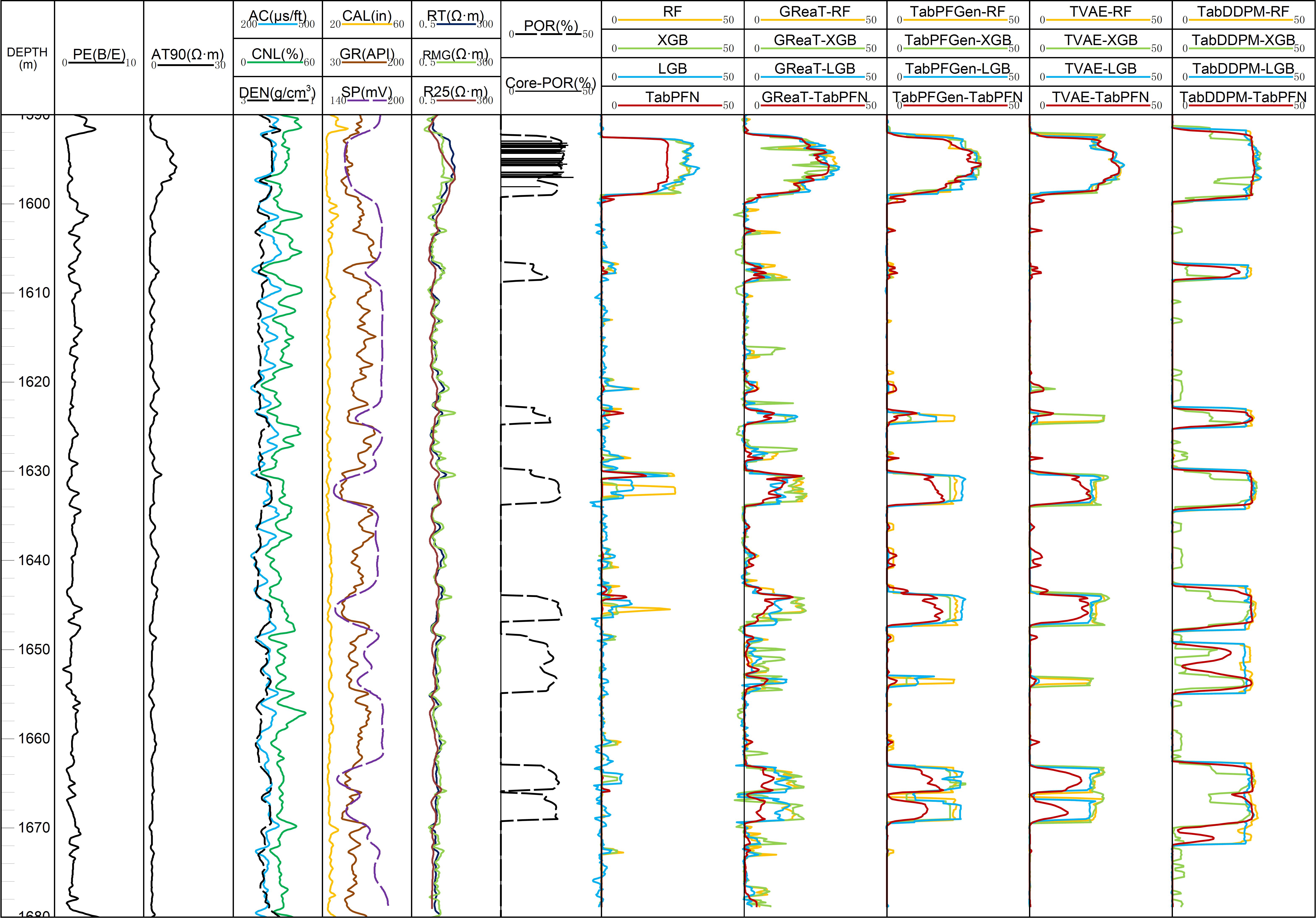 可靠性分析结果表明,岩心数据增强中的表格变分自编码器(TVAE)、增量表格变分自编码器(DeltaVAE)和表格去噪扩散概率模型(TabDDPM)为小尺度数据集生成了高质量的合成输出。对于大规模数据生成,预训练的大语言模型(GReaT 和TabPFGen)表现出强大的潜在性能。在应用效果方面,在各种岩心数据增强-机器学习模型组合中,TabDDPM-TabPFN表现优越的潜在性能。分别在岩性分类、孔隙度、渗透率预测方面,TabDDPM-TabPFN取得最好的应用效果(图4)。在未来的研究中,我们旨在探索该工作流程在更复杂油藏中的适用性,并将岩心数据增强与物理模型相结合,以进一步增强合成数据集的可靠性。