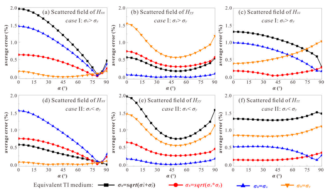 图2.不同各向异性情况下,同轴与共面分量二次场逼近计算结果与严格计算结果(改进幅度传播矩阵方法,MAPM)的平均误差:(a) Sca_Hxx_case I; (b) Sca_Hyy_case I; (c) Sca_Hzz_case I; (d) Sca_Hxx_case II; (e) Sca_Hyy_case II; (f) Sca_Hzz_case II