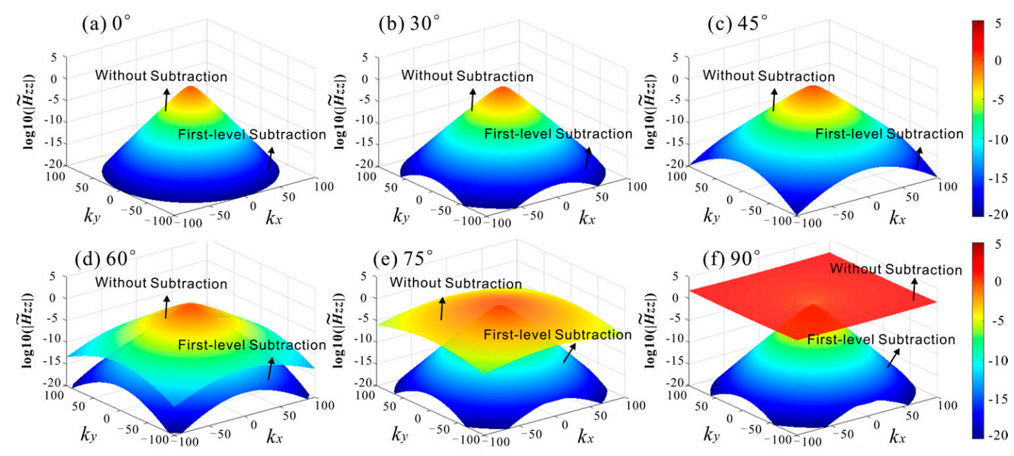 图1.不同井斜角α情况下,第一级奇异性消除前后谱域一次场收敛性效果对比:(a) α= 0°; (b) α= 30°; (c) α= 45°; (d) α= 60°; (e) α= 75°; (f) α= 90°