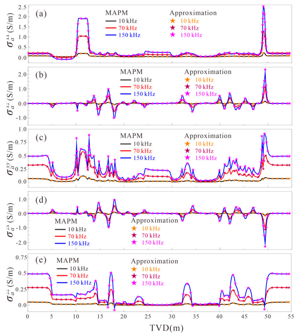 图4.不同频率情况下,分别采用改进幅度传播矩阵方法(MAPM)与逼近计算方法计算的同轴、共面与交叉分量响应对比