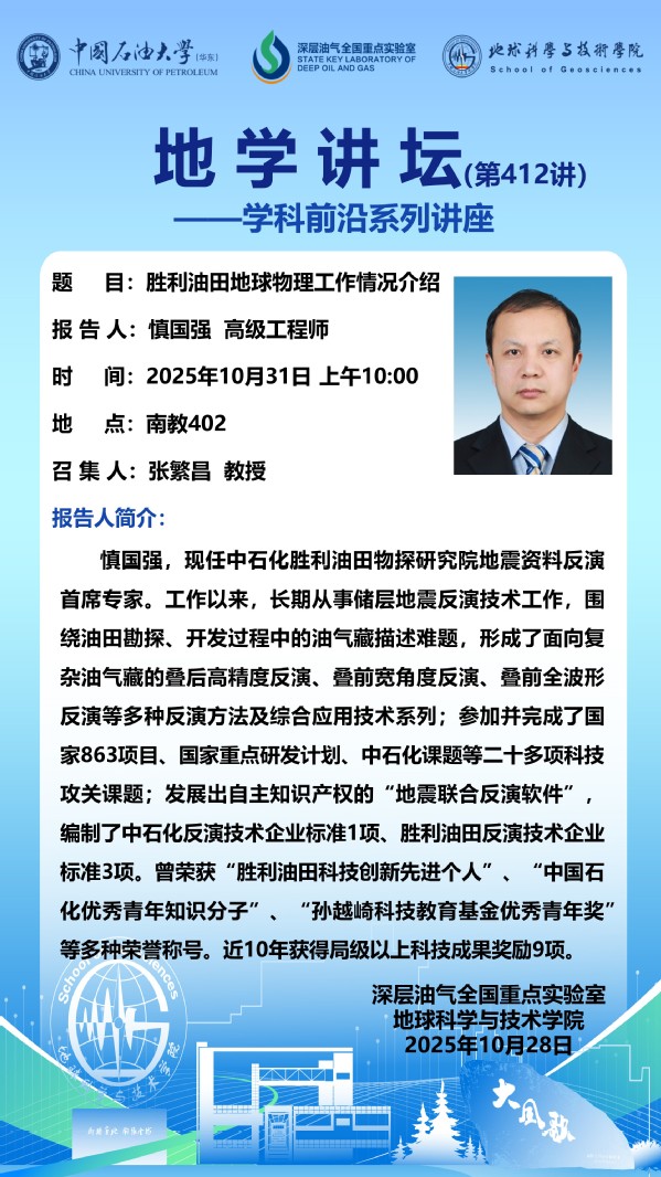 【地学讲坛第412讲】关于慎国强 高级工程师《胜利油田地球物理工作情况介绍》学术报告的通知