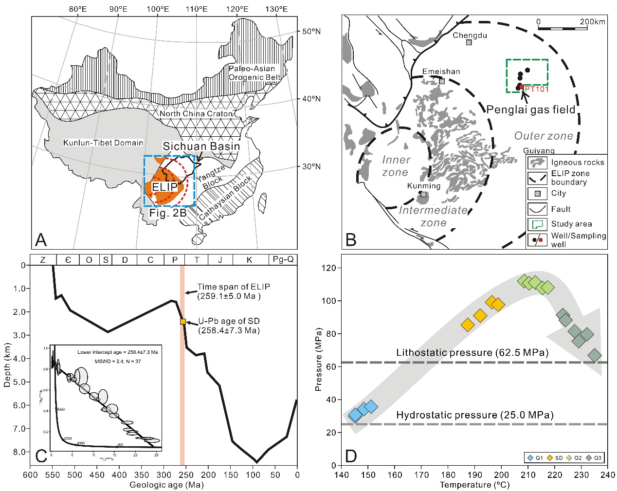 针对上述科学问题,冰球突破mg正规官网刘可禹教授团队联合北京大学金之钧院士和中石油勘探开发研究院CNPC盆地构造与油气成藏重点实验室等单位,选取位于峨眉山大火成岩省(ELIP)外带的川中蓬莱地区埃迪卡拉纪碳酸盐岩储层作为研究对象,通过对石英和马鞍状白云石等热液矿物开展详细的岩相学、流体包裹体和微区地球化学分析,证实川中地区埃迪卡拉纪碳酸盐岩储层中古油藏的快速热解发生在距今约258.4±7.3Ma(百万年),与ELIP的爆发密切相关(图1)。热液矿物中的烃类包裹体记录了古油藏的热解过程,储层压力经历先增加后快速下降的过程,指示古油藏中形成的热成因甲烷沿断层或岩浆管道快速排放到大气中,进而对瓜德鲁普世末期大灭绝产生影响。