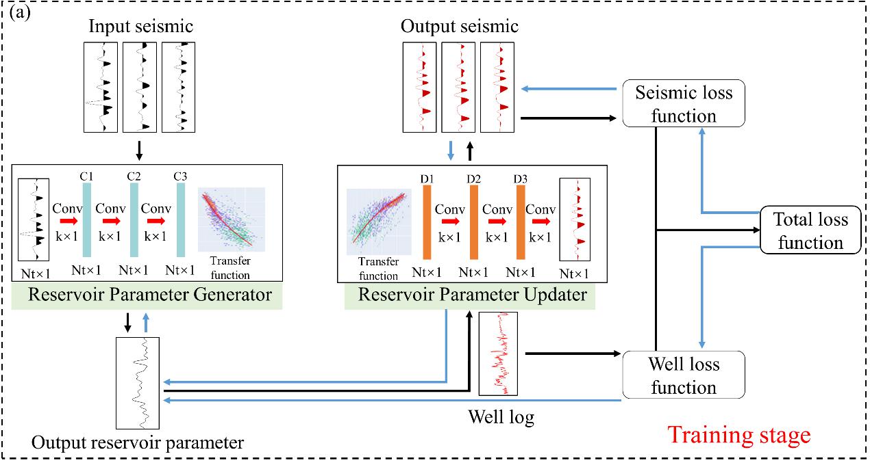 本研究针对地震反演问题的特点,提出了一种独特的知识嵌入式闭环(KECL)深度学习框架。KECL 深度学习框架由储层参数生成器(RPG)和储层参数更新器(RPU)组成。前半环是RPG,它将地震数据作为输入,生成初始储层参数。后半环为RPU,以初始参数为输入,输出合成地震数据。通过测井数据的训练,利用油田地震数据与RPU模拟的合成地震数据之间的差异来优化RPG和RPU。在这个深度学习框架中,嵌入地震卷积模型知识,以解决标签不足的问题。此外,半监督学习被用作先验信息减少反演结果的不确定性。训练完成后,在先验地质信息数据的帮助下,利用RPU更新RPG生成的初始参数,完成最终的储层参数反演。