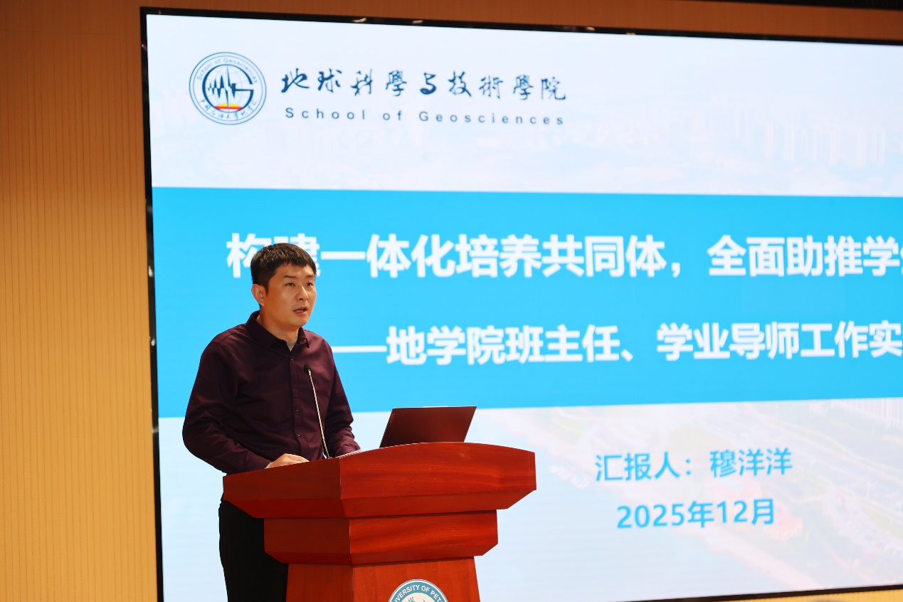 穆洋洋首先从生源和专业认同情况分析了学院人才培养工作面临的困境,并系统介绍了学工队伍、教学副院长、各系分管教学副主任、学业导师、教学秘书联动,以及学工队伍、各系副书记、班主任联动的“双联动”一体化育人工作体系,班主任重点围绕班级建设、学风建设、职业生涯规划,学业导师重点围绕学业指导、创新创业教育、专业认知教育,与辅导员形成育人合力。接下来,穆洋洋从三个方面具体汇报了学院班主任、学业导师工作开展情况。一是聚焦顶层设计,筑牢制度保障和组织根基。学院以制度建设为核心,通过完善制度体系、优化队伍配置、健全联动培育机制三维发力,夯实班主任工作根基。二是聚焦关键环节,强化思想引领和学风建设。学院紧扣育人主线,引导班主任、学业导师深入学生中间,精准开展思想政治教育和关心关爱工作,实现思政育人、学术育人、实践育人有机融合,强化师生情感联结。三是聚焦育人实效,彰显实践成果与教育担当。在师生共同努力下,班级内在活力不断激发,班级建设取得一系列积极成效。学院连续10年获评十佳班主任,“十四五”先进班集体达标率较“十三五”提升超20%,连年获评学校优良学风标兵班、首批十佳班集体等。近五年平均就业率超94%,超75%赴“三油一调”等国家能源企业,本科升学率超60%。