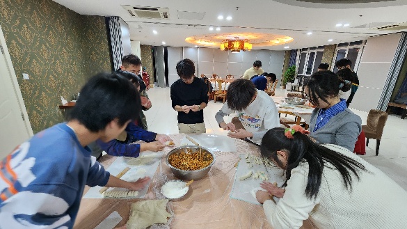 参观结束后,师生返回校园,共同参加“师生同乐,饺子迎新年”主题活动。大家围在一起,亲手和面、擀皮、包馅,气氛温馨融洽。范宜仁、邓少贵、王正楷、王磊、陈雪、王亚洲等老师与同学们围坐交流。多位学生轮流发言,分享入学以来的成长与感动,并表达对老师和同学的新年祝福。现场欢声笑语,洋溢着团聚的温暖氛围。