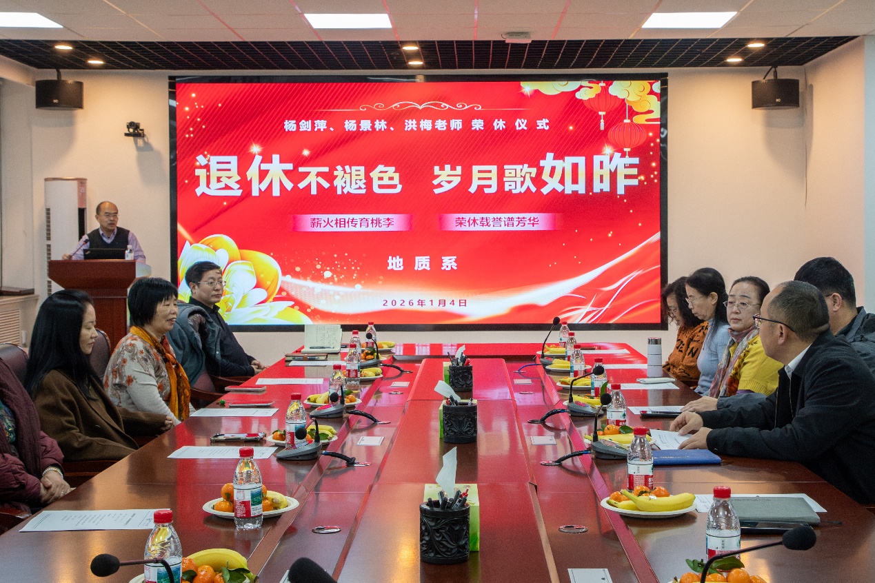 2026年1月4日上午,地质系在学院C271会议室为杨剑萍、杨景林、洪梅三位老师举办了一场温馨而隆重的荣休座谈会。会议由地质系主任陈勇主持,学院院长宗兆云、学院工会主席张福明以及地质系全体教师共同参会。
