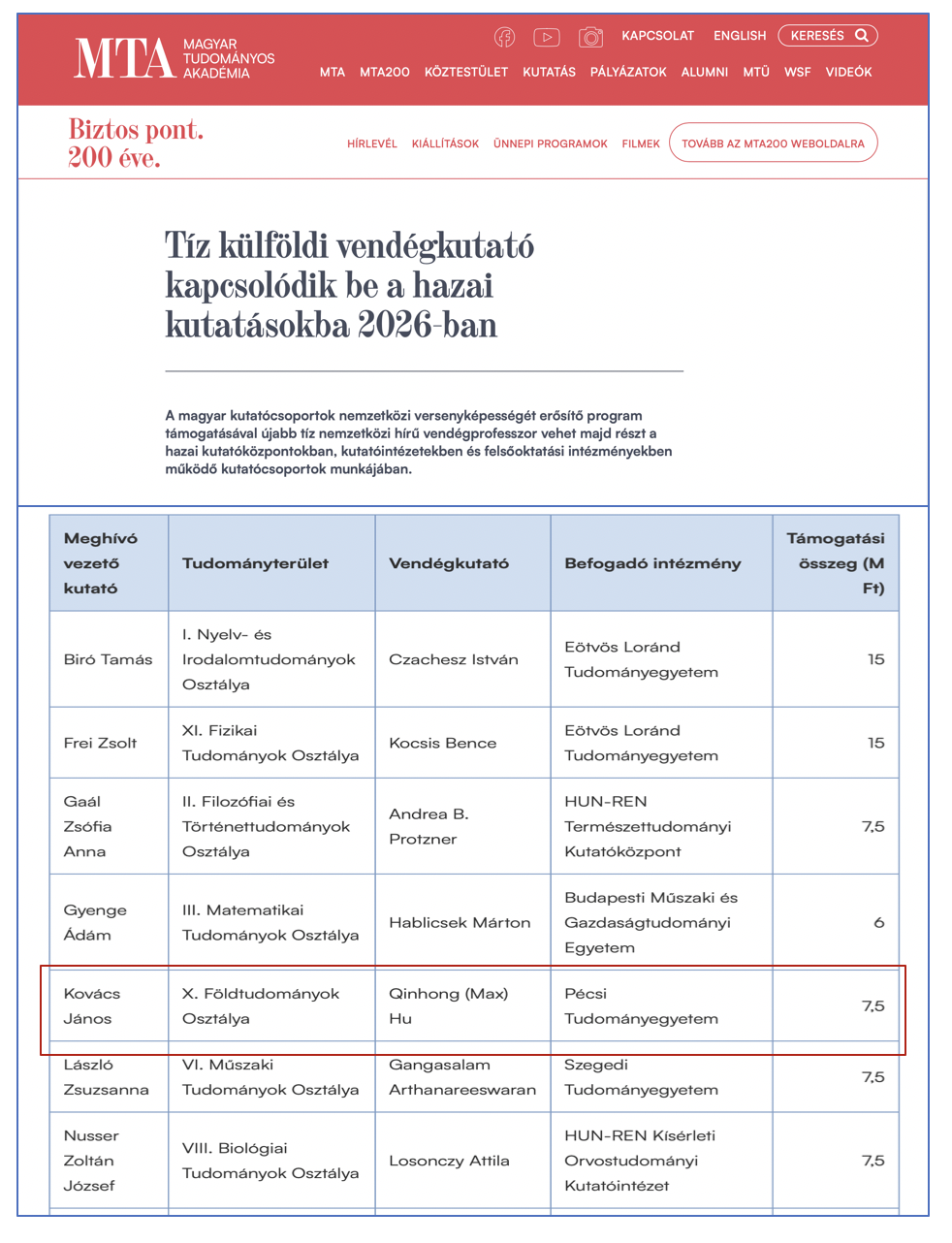 近日,匈牙利科学院公布2026年客座研究员计划入选名单,冰球官网胡钦红教授成为全球10名入选专家之一,获全额资助将赴佩奇大学等高校和科研机构开展为期近3个月的科学研究,同时进行由匈牙利科学院组织的学术讲座。