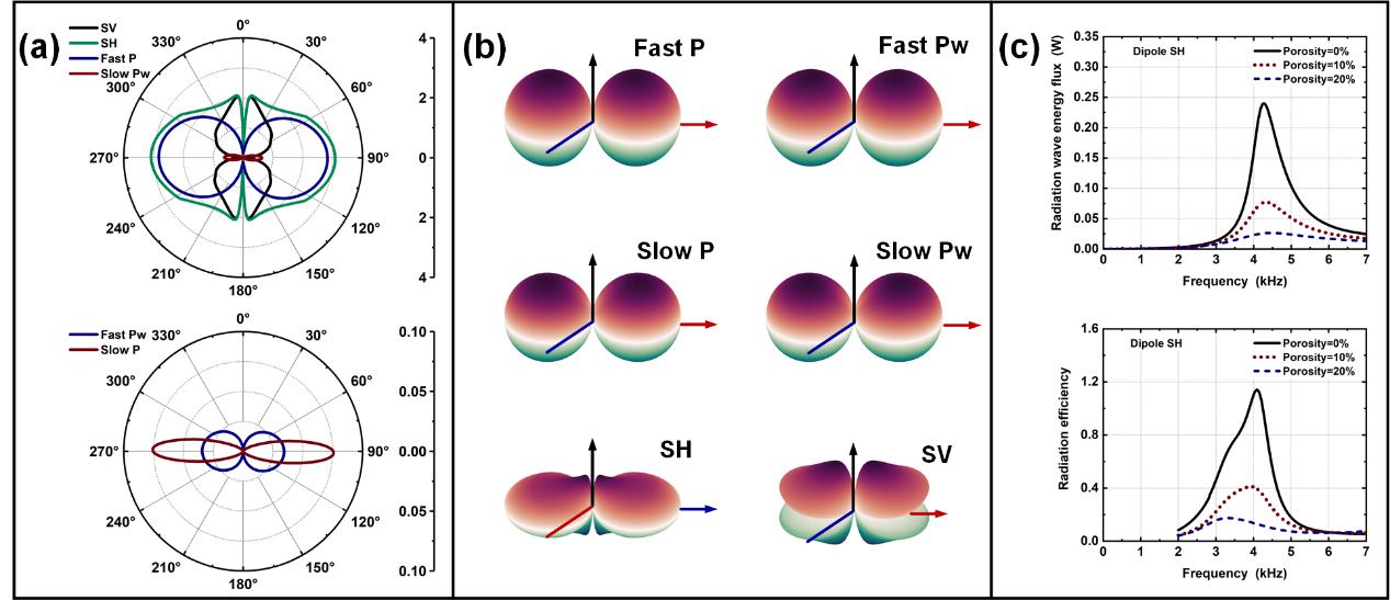 图1.孔渗地层(a)井中偶极声源的辐射指向性(b)三维展示图以及(c)SH波辐射能流和辐射效率