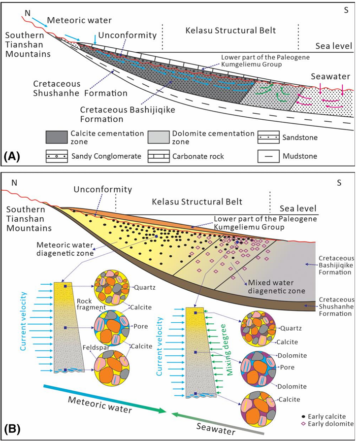 图1 库车坳陷克拉苏构造带白垩系巴什基奇克组早期碳酸盐胶结物成因模式
