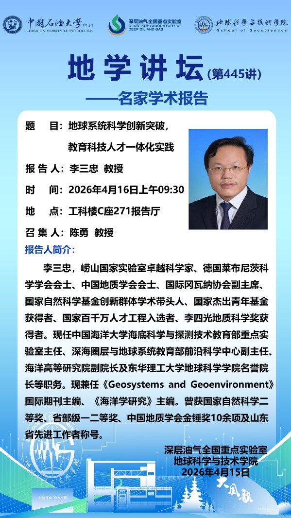 【地学讲坛第445讲】关于李三忠教授《地球系统科学创新突破,教育科技人才一体化实践》学术报告的通知